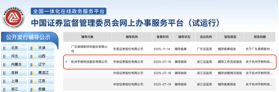 RobotNews消息,近日从中国证监会官网11月15日公告获悉,备受关注的人形机器人公司宇树科技已于11月10日完成上市辅导,进入辅导验收阶段。中信证券担任辅导机构。