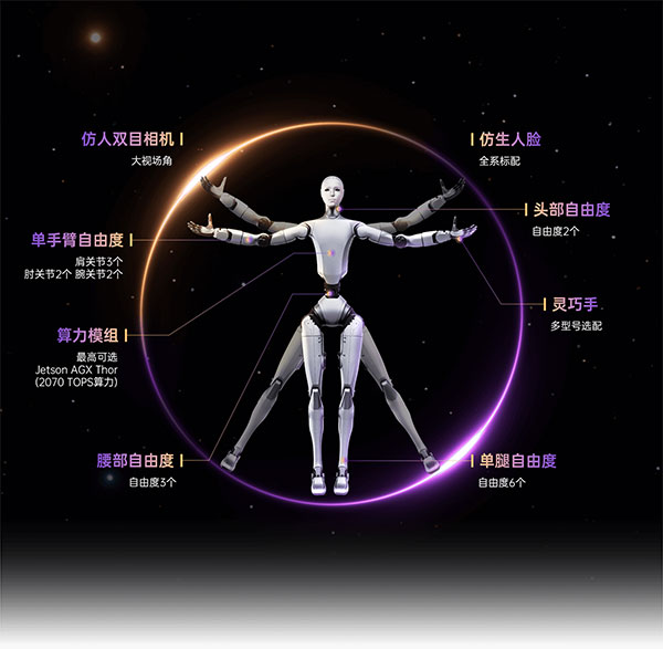搭载最高2070 TOPS算力芯片,可用于部署各类具身智能大模型,赋能多元工作场景,推动人形机器人持续探索边界。