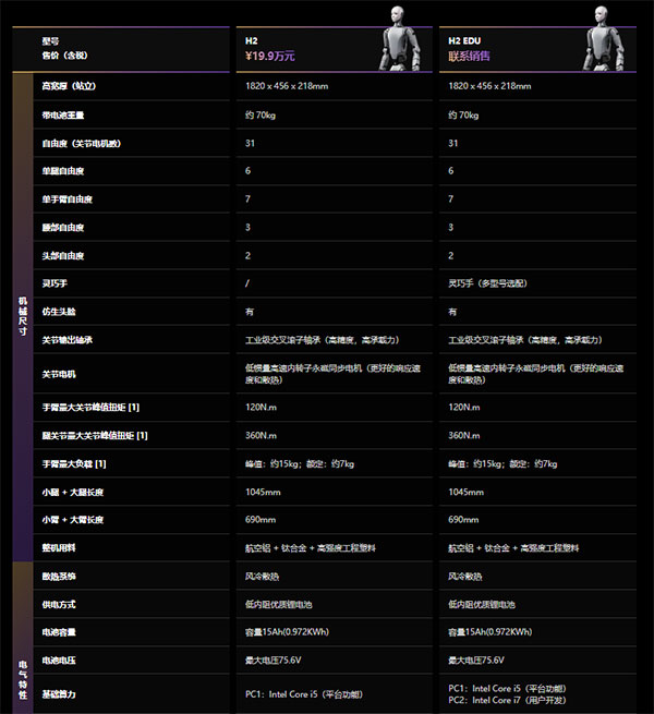 宇树双足人形机器人H2 天命觉醒,身高180cm、体重70kg;H2具有31个关节,分布在双臂、双腿以及躯干等位置。具体来说,双臂上,每个手臂有6个关节,共12个;单个腿部有7个关节,共14个;躯干关节有3个;其中还有2个暂未公开用途的功能关节; 刚刚发布的视频中,H2可以优雅地抬手旋转、跳跃,献上一支芭蕾舞,也可以使出一套武术连招,包括翻转、踢腿、挥拳等,整套动作行云流水。